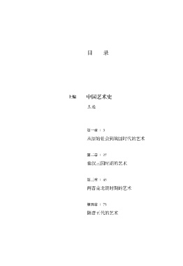 目 录 上编 中国艺术史 王逊 第一章 ︱ 3 从原始社会到战国时代的艺术 第二章 ︱ 27 秦汉三国时期的艺术 第三章 ︱ 45 两晋南北朝时期的艺术 第四章 ︱ 75 隋唐五代的艺术