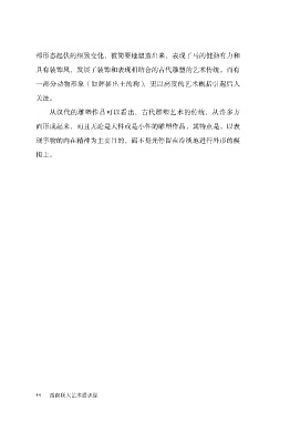 部形态起伏的细致变化,被简要地塑造出来,表现了马的健劲有力和 具有装饰风,发展了装饰和表现相结合的古代雕塑的艺术传统。而有 一部分动物形象(如辉县出土的狗),更以高度的艺术概括引起后人 关注。 从汉代的雕塑作品可以看出,古代雕塑艺术的传统,从许多方 面形成起来,而且无论是大件或是小件的雕塑作品,其特点是,以表 现事物的内在精神为主要目的,而不是光停留在冷淡地进行外形的模 拟上。 44 西南联大艺术通识课