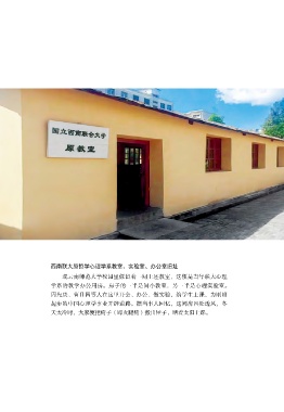 西南联大原哲学心理学系教室、实验室、办公室旧址 现云南师范大学校园里保留着一间土坯教室,这便是当年联大心理 学系的教学办公用房。房子的一半是间小教室,另一半是心理实验室。 周先庚、曹日昌等人在这里开会、办公、做实验,给学生上课,为刚刚 起步的中国心理学事业开辟道路。据当事人回忆,这间房四处透风,冬 天太冷时,大家便把椅子(即火腿椅)搬出屋子,晒着太阳上课。