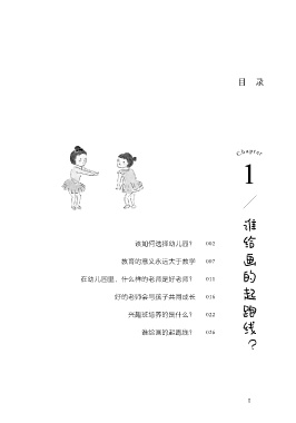 目 录 Chapter 1 谁给画的起跑线? 该如何选择幼儿园? 002 教育的意义永远大于教学 007 在幼儿园里,什么样的老师是好老师? 011 好的老师会与孩子共同成长 016 兴趣班培养的是什么? 022 谁给画的起跑线? 026 I