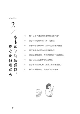 Chapter 2 尊重孩子的敏感期, 032 为什么孩子对细微的事物特别感兴趣? 036 孩子什么时候形成“我”的意识? 他会更好地成长 039 孩子的语言敏感期,家长的引导至关重要 042 孩子执拗是必经的内在发育阶段 046 把握动作敏感期,有效培养孩子的运动能力 050 孩子从自己玩到学会结交朋友 052 孩子喜欢乱涂乱画,是进入书写敏感期了 055 抓住阅读敏感期,培养爱阅读的孩子 II