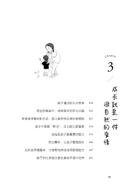 目 录 Chapter 3 成长就是一件 很自然的事情 孩子通过玩认识世界 058 在自然教育中,培养孩子的学习兴趣 063 养育孩子最好的方式,是让孩子自由自在地成长 067 孩子不需要“听话”,自主能力更重要 070 自信是孩子最重要的能力 076 在分离中,让孩子慢慢成长 080 允许孩子慢慢来,才能帮他养成时间管理能力 087 孩子的社交能力要在集体环境中培养 092 III