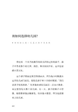 园长妈妈育儿课 该如何选择幼儿园? ● 好的幼儿园一定是以孩子为本的 曾经有一个从当地最贵的幼儿园转过来的孩子,孩 子不喜欢那个幼儿园,挑食,整天闷闷不乐,也不愿意 跟小朋友玩。 这个孩子转园过来后特别高兴,因为他小时候就在 这所幼儿园门前玩。姥姥送孩子来上学的时候说:“我们 家孩子吃饭挑食。”结果他来到幼儿园后一点也不挑食, 而且坚持每天都上幼儿园。有一天,孩子的嗓子不舒 服,姥姥想带他去做雾化,结果他不愿意,因为他就想 来上幼儿园。 002