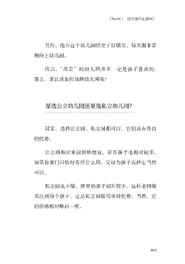 Chapter 1 谁给画的起跑线? 另外,他在这个幼儿园结交了好朋友,每天都非常 期待上幼儿园。 所以,“昂贵”的幼儿园并不一定是孩子喜欢的。 那么,家长该如何选择幼儿园呢? 是选公立幼儿园还是选私立幼儿园? 其实,选择公立园、私立园都可以,它们具有各自 的优势。 公立园相对来说价格便宜,而且孩子也相对较多。 如果你家门口恰好有所公立园,父母为孩子选择它当然 可以。 私立园也不错,班里的孩子相对较少,这样老师能 关注到每个孩子,这是私立园很明显的优势。当然,它 的价格相对略高一些。 003