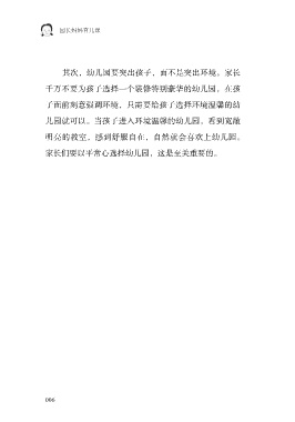 园长妈妈育儿课 其次,幼儿园要突出孩子,而不是突出环境。家长 千万不要为孩子选择一个装修特别豪华的幼儿园,在孩 子面前刻意强调环境,只需要给孩子选择环境温馨的幼 儿园就可以。当孩子进入环境温馨的幼儿园,看到宽敞 明亮的教室,感到舒服自在,自然就会喜欢上幼儿园。 家长们要以平常心选择幼儿园,这是至关重要的。 006