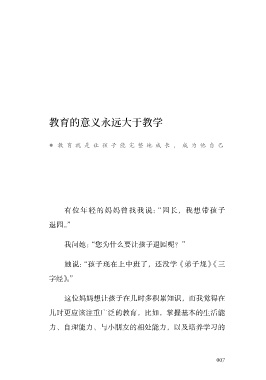 Chapter 1 谁给画的起跑线? 教育的意义永远大于教学 ● 教育就是让孩子能完整地成长,成为他自己 有位年轻的妈妈曾找我说:“园长,我想带孩子 退园。” 我问她:“您为什么要让孩子退园呢?” 她说:“孩子现在上中班了,还没学《弟子规》《三 字经》。” 这位妈妈想让孩子在儿时多积累知识,而我觉得在 儿时更应该注重广泛的教育,比如,掌握基本的生活能 力、自理能力、与小朋友的相处能力,以及培养学习的 007