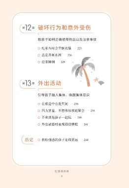 12 第 章 破坏行为和意外受伤 教孩子如何正确使用物品以及注意事项 吃东西时会弄脏衣服 · 223 总是弄坏东西 · 226 经常摔倒 · 229 13 外出活动 第 章 引导孩子融入集体,唤醒集体意识 在旅途中总是哭闹 · 236 因为害羞,不想参加家庭聚会 · 238 不和其他孩子一起玩 · 240 外出就餐时表现得很糟糕 · 241 后记 有松弛感的孩子走得更远 · 244 松弛 感 养育 ·8·