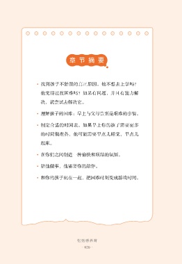 章节 摘 要 • 找到孩子不舒服的真正原因。他不想去上学吗? 他觉得过渡困难吗?如果有问题,并且有能力解 决,就尝试去解决它。 • 理解孩子的困难:早上与父母告别是艰难的事情。 • 制定合适的时间表。如果早上你的孩子需要更多 的时间做准备,他可能需要早点儿睡觉,早点儿 起床。 • 在你们之间创造一种愉快和联结的氛围。 • 陪他做事,他需要你的陪伴。 • 和你的孩子玩在一起,把困难时刻变成游戏时间。 松弛 感 养育 ·020·