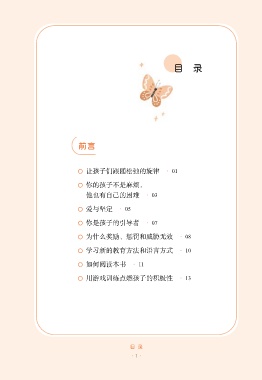 目 录 前言 让孩子们跟随松弛的旋律 · 01 你的孩子不是麻烦, 他也有自己的困难 · 03 爱与坚定 · 05 你是孩子的引导者 · 07 为什么奖励、惩罚和威胁无效 · 08 学习新的教育方法和语言方式 · 10 如何阅读本书 · 11 用游戏训练点燃孩子的积极性 · 13 目 录 ·1·