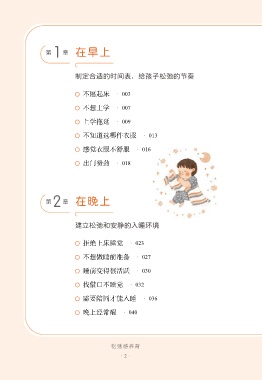 1 在早上 第 章 制定合适的时间表,给孩子松弛的节奏 不愿起床 · 003 不想上学 · 007 上学拖延 · 009 不知道选哪件衣服 · 013 感觉衣服不舒服 · 016 出门费劲 · 018 2 第 章 在晚上 建立松弛和安静的入睡环境 拒绝上床睡觉 · 023 不想做睡前准备 · 027 睡前变得很活跃 · 030 找借口不睡觉 · 032 需要陪同才能入睡 · 036 晚上经常醒 · 040 松弛 感 养育 ·2·