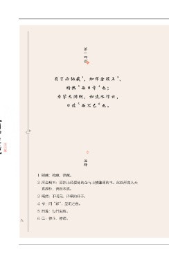 第一四则 1 2 有才必韬藏 ,如浑金璞玉 , 3 4 暗然 而日章 也; 为学无间断,如流水行云, 5 6 【围炉夜话】 日进 而不已 也。 注释 1 韬藏:掩藏,深藏。 2 浑金璞玉:原指未经提炼的金与未被雕琢的玉。此处形容人天 真淳朴,善良本真。 3 暗然:不明亮,昏暗的样子。 4 章:同“彰”,显明之意。 一八 5 日进:每日进取。 6 已:停止,停滞。