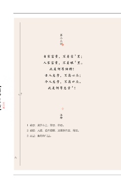 第二三则 1 自家富贵,不着意 里; 2 人家富贵,不着眼 里。 此是何等胸襟! 【围炉夜话】 古人忠孝,不离心头; 今人忠孝,不离口头。 3 此是何等志量 ! 注释 1 着意:放在心上,留意,在意。 2 着眼:入眼,看在眼里,这里指在意,留意。 3 志量:抱负和气量。 二八