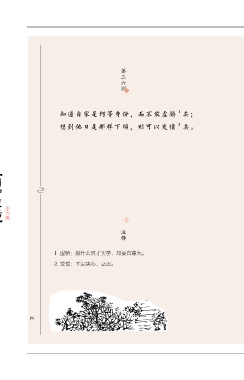 第三六则 1 知道自家是何等身份,而不敢虚骄 矣; 2 想到他日是那样下场,则可以发愤 矣。 【围炉夜话】 注释 1 虚骄:没什么真才实学,却妄自尊大。 2 发愤:下定决心,立志。 四四