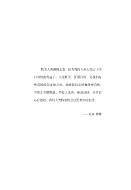 我为人类感到悲哀,因为我们人类太关注于为 自身创造利益了。人定胜天,征服自然,是我们对 待自然的态度和方式。如果我们友好地对待自然, 不那么专横跋扈,学着去适应、珍爱地球,并对它 心存感恩,我们人类将有机会过更美好的生活。 —— E.B. 怀特