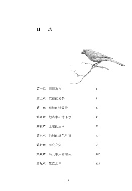 目 录 第一章 明日寓言 1 第二章 忍耐的义务 5 第三章 死神的特效药 17 第四章 地表水和地下水 41 第五章 土壤的王国 55 第六章 地球的绿色斗篷 67 第七章 无妄之灾 91 第八章 鸟儿歌声的消失 107 第九章 死亡之河 135 1