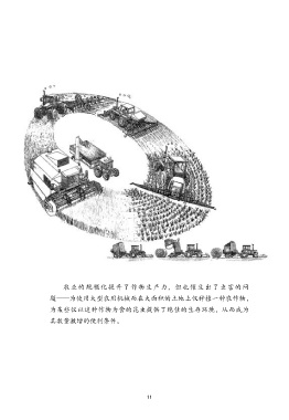 农业的规模化提升了作物生产力,但也催生出了虫害的问 题——为使用大型农用机械而在大面积的土地上仅种植一种农作物, 为某些仅以这种作物为食的昆虫提供了绝佳的生存环境,从而成为 其数量激增的便利条件。 11