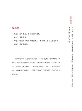 《南山经》 食者不肿,可以已痔。 泿( 蛇尾鱼 yín )水出焉,而南流注于海。其中有虎蛟,其状鱼身而蛇尾,其音如鸳鸯, ﹝形态﹞ 身子像鱼,却长着蛇的尾巴 ﹝叫声﹞ 像鸳鸯叫 ﹝功效﹞ 传说吃了它的肉就能使人不生痈肿,还可以治愈痔疮 ﹝住址﹞ 祷过山 水 虎蛟是传说中龙的一个种类,古代民间有“化蛟成龙”的 说法。据古籍《述异记》记载,“虺五百年化为蛟,蛟千年化为 龙,龙五百年化为角龙,千年则成为应龙。”蛟生活在江河湖海 中,又被称为“潜蛟”,一旦化龙就有了质的飞跃,可以飞上九 重云霄。 31