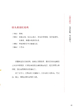 《西山经》 鸟多赤 绿头黄羽红尾鸡 ,可以御火。 ﹝今名﹞ 锦鸡 ﹝形态﹞ 很像山鸡,但比山鸡小,羽毛非常鲜艳,冠背金黄色, 头绿色,胸腹和尾部赤红色 ﹝功效﹞ 传说饲养它可以躲避火灾 ﹝住址﹞ 小华山 赤 知道自己很漂亮,据说它非常自恋,整天在水岸边看自 己在水中的倒影,结果水面反射出来的艳丽光芒,把它照得头晕 目眩,最后竟然跌到水里淹死了。 除了小华山,《西山经》的嶓冢山,《中山经》的牡山、夸父 山、岷山,都有这种叫赤 的飞禽。 41