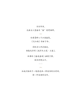 古往今来, 无数文人墨客对“春”情有独钟。 ~ 白居易醉心于江南春色, 《忆江南》传世于今。 苏轼为人率真豁达, 借春光抒写《减字木兰花·立春》。 杜甫的《春夜喜雨》融情于景, 读来朗朗上口。 …… ~ 让我们陪孩子一起感受画一样美丽的古诗词, 诗一样美丽的自然。