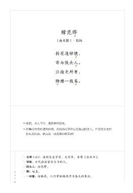 赠范晔 [南北朝]·陆凯 折花逢驿使, 寄与陇头人。 江南无所有, 聊赠一枝春。 ◎ ◎ 陆凯,其人不详,是范晔的朋友。 ◎ ◎ 折梅花时恰好遇到驿使,托他将花带给远在陇山的友人。江南没有更好 的礼品相送,姑且送一枝报春的梅花吧! · 范晔(yè):南朝宋史学家、文学家,著有《后汉书》。 · 驿使:古代递送官府文书的人。 · 陇头人:指范晔。 0 · 聊:姑且。 0 · 一枝春:指梅花,人们常把梅花作为春天的象征。 0