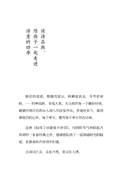 诗意的四季 陪孩子一起走进 读诗品画, 微茫的春雨,微醺的夏日,秋蝉哀哀去,冬雪初霁 时,……四季流转,呈现大美。大自然的每一个微妙时刻, 都被历朝历代的诗人词人们反复吟咏,并流传至今,滋润 着我们的心田。每个季节,都有每个季节的古诗词。 这套《陪孩子读最美古诗词》,用四时节气串联起古 诗词的一首首经典之作,邀请您陪孩子一起穿越时光的隧 道,在最美的古诗词中相遇。 古诗词之美,美在自然,更美在人情。