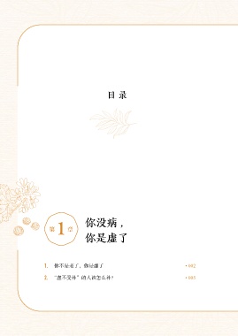 目 录 1 你没病 , 第 章 你是虚了 1. 你不是老了,你是虚了 • 002 2. “虚不受补”的人该怎么补? • 005