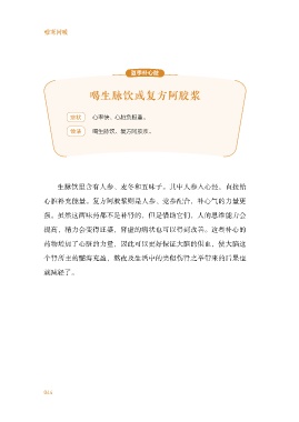 嘘寒问暖 夏季补心脏 喝生脉饮或复方阿胶浆 症状 心率快、心脏负担重。 做法 喝生脉饮、复方阿胶浆。 生脉饮里含有人参、麦冬和五味子。其中人参入心经,直接给 心脏补充能量。复方阿胶浆则是人参、党参配合,补心气的力量更 强。虽然这两味药都不是补肾的,但是借助它们,人的思维能力会 提高,精力会变得旺盛,肾虚的病状也可以得到改善。这些补心的 药物增加了心脏的力量,因此可以更好保证大脑的供血,使大脑这 个肾所主的髓海充盈,熬夜及生活中的类似伤肾之举带来的后果也 就减轻了。 044