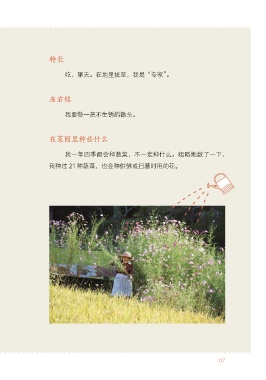 特长 吃、聊天。在地里拔草,我是“专家”。 座右铭 我要做一把不生锈的锄头。 在菜园里种些什么 我一年四季都会种蔬菜,不一定种什么。粗略地数了一下, 我种过 21 种蔬菜,也会种供佛或扫墓时用的花。 07