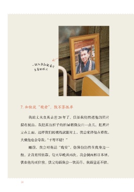 一转头我就能看 见 良英的照片 7. 和他说“晚安”,就不算孤单 我的丈夫良英去世 20 年了,但是我仍然把他的照片 摆在枕边。我把床边柜子的抽屉稍微拉出一点儿,把照片 立在上面,这样我们的视线就能对上。我总觉得他在看我。 大概他也会夸我:“干得不错!” 睡前,我会对他说“晚安”,仿佛他仍然在我身边一 般,让我有所依靠。每天早晚共两次,我会倒两杯日本酒, 供在他的灵位前。供完的酒我会一饮而尽。我酒量还不错。 14
