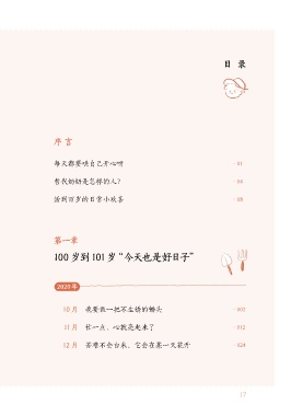 目录 序 言 每天都要哄自己开心呀 ·01 哲代奶奶是怎样的人? ·04 活到百岁的日常小欢喜 ·08 第一章 100 岁到 101岁“今天也是好日子” 2020年 10 月 我要做一把不生锈的锄头 ·002 11月 忙一点,心就亮起来了 ·012 12 月 苦难不会白来,它会在某一天花开 ·024 17