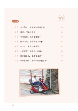 2021 年 2 月 今天努力,明天就会闪闪发亮 ·034 3 月 活着,不如活明白 ·044 4 月 带着笑意,把病也吓跑了 ·052 5月 换个心情,世界也会不一样 ·062 6月 一个人,也可以很热闹 ·072 10 月 一起种菜,也是人生的缘分 ·076 11月 就算说再见,也要笑着挥手 ·083 12 月 记住你的人,就证明你活得真好 ·092 18