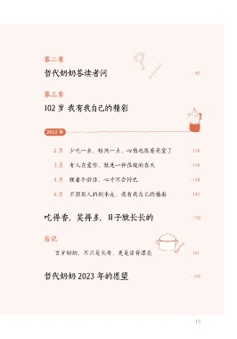? ? 第二章 ! 哲代奶奶答读者问 ! ·101 第三章 102 岁 我有我自己的精彩 2022 年 2 月 少吃一点,轻快一点,心情也跟着亮堂了 ·128 3 月 有人在意你,就是一种很暖的春天 ·130 4 月 顺着年龄活,心才不会拧巴 ·138 6月 不照别人的剧本走,我有我自己的精彩 ·143 吃得香,笑得多,日子就长长的 ·152 后记 百岁奶奶,不只是长寿,更是活得漂亮 ·161 哲代奶奶 2023 年的愿望 ·165 19