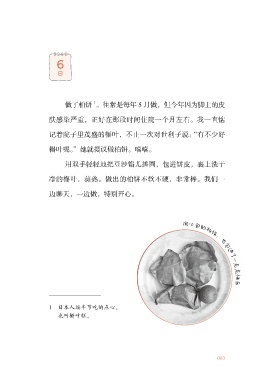 6 日 1 做了柏饼 。往常是每年 5 月做,但今年因为脚上的皮 肤感染严重,正好在那段时间住院一个月左右。我一直惦 记着院子里茂盛的槲叶,不止一次对世利子说:“有不少好 槲叶呢。”她就提议做柏饼。嘻嘻。 用双手轻轻地把豆沙馅儿搓圆,包进饼皮,裹上洗干 净的槲叶,蒸熟。做出的柏饼不软不硬,非常棒。我们一 边聊天,一边做,特别开心。 1 日本人端午节吃的点心, 用心包的柏饼,也包进 了 一 点点快乐 也叫槲叶糕。 003