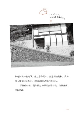 人 生也是这样, 回头看看才懂得珍惜 和这斜坡一较高下,并且乐在其中。托这斜坡的福,我的 身心都变得很强壮。我总会给自己加油鼓劲儿。 下坡的时候,偶尔路过的邻居会看着我,怕我摔倒。 我很感激。 013