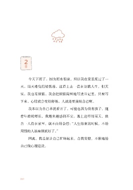 2 日 今天下雨了。因为雨水很凉,所以我在家里度过了一 天。雨天难免情绪低落。这看上去一直在讴歌人生,但其 实,我也有烦恼。我会把烦恼简短地写进日记里,只要写 下来,心情就会变得舒畅。人就是要接纳自己啊。 我本以为自己早就看开了,可能也因为没有孩子,随 着年龄的增长,我越来越感到不安。遇上这样的雨天,独 自一人待在家里,就不由得会想:“人生结束的时候,不给 周围的人添麻烦就好了。” 因此,我总是让自己忙碌起来,自我安慰,不断地给 自己做心理建设。 014