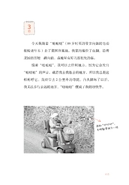 3 日 今天我骑着“哒哒哒”(89 岁时买的带方向盘的电动 轮椅老年车)去了菜园和墓地。我家的墓位于山脚,沿着 菜园的田埂一路向前。墓地里有好几座祖先的墓。 骑着“哒哒哒”,我可以去任何地方。因为它会发出 “哒哒哒”的声音,载着我去我想去的地方,所以我总是这 样称呼它。我经常去 2 公里外的寺院。自从脚坏了以后, 我无法步行去远的地方,“哒哒哒”便成了我的好伙伴。 我的 “哒哒哒” , 去哪都带我飞 一程 015