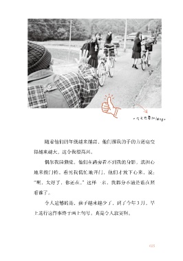 “今天也要加油呀” 随着他们的年级越来越高,他们握我的手的力道也变 得越来越大,这令我很高兴。 偶尔我睡懒觉,他们在路旁看不到我的身影,就担心 地来按门铃。看见我慌忙地开门,他们才放下心来,说: “啊,太好了,你还在。”这样一来,我都分不清是谁在照 看谁了。 令人遗憾的是,孩子越来越少了,到了今年 3 月,早 上送行这件事终于画上句号。真是令人寂寞啊。 025