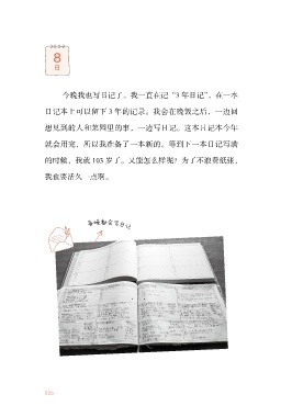 8 日 今晚我也写日记了。我一直在记“3 年日记”,在一本 日记本上可以留下 3 年的记录。我会在晚饭之后,一边回 想见到的人和菜园里的事,一边写日记。这本日记本今年 就会用完,所以我准备了一本新的。等到下一本日记写满 的时候,我就 103 岁了。又能怎么样呢?为了不浪费纸张, 我也要活久一点啊。 每晚都会写 日记 026