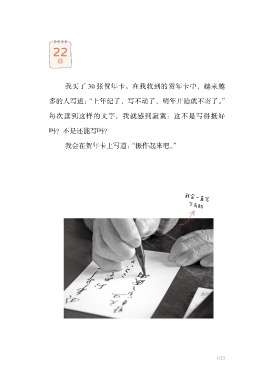22 日 我买了 30 张贺年卡。在我收到的贺年卡中,越来越 多的人写道:“上年纪了,写不动了,明年开始就不寄了。” 每次读到这样的文字,我就感到寂寞:这不是写得挺好 吗?不是还能写吗? 我会在贺年卡上写道:“振作起来吧。” 我会 一 直写 下 去的 033