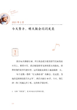 哲代奶奶 100 岁的日记 2021 年 2 月 今天努力,明天就会闪闪发亮 1 日 因为每天都很忙碌,所以我会把日程安排写在厨房的 日历上。看着日历,就会想起将要见面的朋友的脸庞。把 值得期待的事写进日程,这样就能充满活力地迎接新一天。 每个星期一都有“好友俱乐部”的聚会。在这里,当 1 地的老奶奶们练习大正琴 。曲目大概有 40 首。今天,我们 弹一曲《荒城之月》吧。这首曲子很好听。 1 又称“凤凰琴”,是日本自行发明的乐器。 034