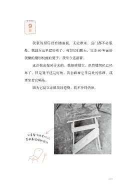 9 日 我家的厨房没有铺地板,无论谁来,进门都不必脱 鞋。我就在这里摆好椅子,和邻居们聊天。父亲 80 年前给 我做的缝纫机前的凳子,我至今还留着。 这是我出嫁时带来的,我很珍惜它。虽然缝纫机已经 坏了,但是凳子还是好的,我会踩着它拿高处的东西,或 者坐着它喝茶。 因为它是父亲留我的遗物,我不舍得扔掉。 父亲留下的老伙计, 是我最温暖的回忆 039