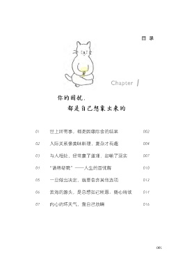 目 录 Chapter 1 你的困扰, 都是自己想象出来的 01 世上所有事,都是因缘际会的结果 002 02 人际关系像美味料理,复杂才有趣 004 03 与人相处,经常赢了道理,却输了现实 007 04 “请帮帮我”——人生的百忧解 010 05 一旦做出决定,就要舍弃其他选项 012 06 苦海的源头,是总想如己所愿、随心所欲 014 07 内心的坏天气,靠自己放晴 016 001
