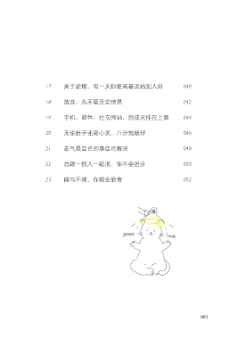17 关于逆境,有一天你要笑着说给别人听 040 18 放弃,先不要否定结果 042 19 手机、邮件、社交网站,别成天挂在上面 044 20 无论肚子还是心灵,八分饱就好 046 21 志气是自己的事自己解决 048 22 总跟一群人一起混,你不会进步 050 23 做与不做,你都会后悔 052 003