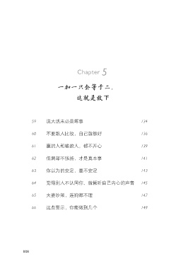 Chapter 5 一加一只会等于二, 这就是放下 59 说大话未必是坏事 134 60 不要跟人比较,自己就很好 136 61 赢的人和输的人,都不开心 139 62 低调却不张扬,才是真本事 141 63 你以为的安定,最不安定 143 64 觉得别人不认同你,就倾听自己内心的声音 145 65 夫妻吵架,连狗都不理 147 66 这些警示,你能做到几个 149 008
