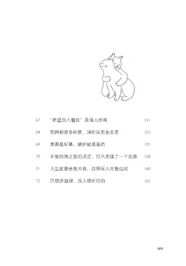67 “希望别人懂我”是强人所难 151 68 想得到更多称赞,评价反而会变差 153 69 羡慕是好事,嫉妒就是毒药 155 70 不要后悔之前的决定,你只是绕了一下远路 158 71 人生就像走独木桥,总得有人先靠边站 160 72 只想讲道理,没人想听你的 162 009