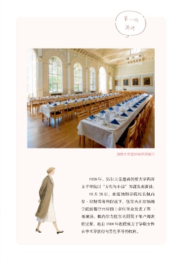 第一场 演讲 剑桥大学纽纳姆学院餐厅 1928 年,伍尔夫受邀到剑桥大学两所 女子学院以“女性与小说”为题发表演讲。 10 月 20 日,在纽纳姆学院校长佩内 尔·斯特雷奇的促成下,伍尔夫在纽纳姆 学院的餐厅面对四十多位听众发表了第一 场演讲。佩内尔与伍尔夫同属于布卢姆茨 伯里派,她自 1909 年起便致力于争取女性 在学术界获得与男性平等的权利。