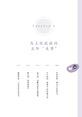 Chapter 6 马上就能做的 五件“美事” / 218 / / 232 / / 241 / / 251 / / 260 / 服饰穿搭,不仅仅是外表的美 断舍离,洒脱地放手 仪式感,切断生活的平庸重复 打扫房间,营造身心的环境之美 有效休息,保持身心的活力