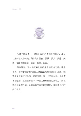 Chapter 1 从这个角度说,一切能让我们产生感受的东西,都可 以去体验其中的美。具体的如美食、美景、美人、美居、美 术,抽象的如美意、美谈、美德,等等。 具体而言,当一篇文章让你产生身临其境之感,这是 审美;当你看到小贩阿姨头上戴着的珍珠发夹闪闪发光,觉 得生活是美好积极的,这是审美;当一个悲剧发生,让你流 下了眼泪,这也是审美……审美力能帮你感知美与丑、崇高 典雅与幽默怪诞。认真体会生活中的悲喜剧,会丰满自己的 内心世界。 010