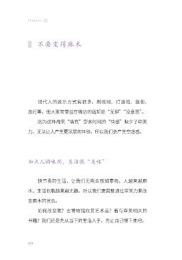 Chapter 1 不要变得麻木 现代人的娱乐方式有很多,刷视频、打游戏、逛街、 旅行等,但大家常常挂在嘴边的话却是“无聊”“没意思”。 因为这种用来“填充”空余时间的“快感”缺少了审美 力,无法让人产生更深层的体验,所以我们会产生空虚感。 加点儿调味剂,生活很“美味” 快节奏的生活,让我们无暇去感知事物,人越来越麻 木,生活也就越来越无趣。所以我们更需要通过审美力来改 变麻木的状态。 如何改变呢?去博物馆欣赏艺术品?看与审美相关的 书籍?我们还是先从当下的生活入手,先让自己慢下来吧。 014