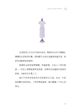 美好的生活离不开审美 无须指责人们对外在美的追求。胖胖的女孩干净精致, 矮矮的女孩娇俏可爱,骑电瓶车也可以涂着漂亮指甲油,好 好生活就是有美感的。 除皱针让面部变得僵硬,衣着粉嫩,又给人一种分裂 感——很多人都想紧紧抓住青春,对年轻的执着和对衰老的 恐惧,也体现在外表上了。 我们不应将内在美和外在美放在对立面。其实,外在 就是最外层的内在,一切外表的装饰,都关联着一个内心的 想法。 027
